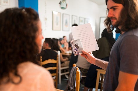 Mediodía del sábado, espero a Lara en la estación de tren con el cartel del evento en mis manos. Nuestro segundo encuentro, aunque no nos daba esa sensación. ¿En serio no somos amigos de toda la vida? Un paseo hacia la cafetería bajo un sol otoñal para el andaluz, veraniego para la gallega. Tras un ligero almuerzo llega, al fin, la hora de hacer nuestro pequeño sueño realidad.